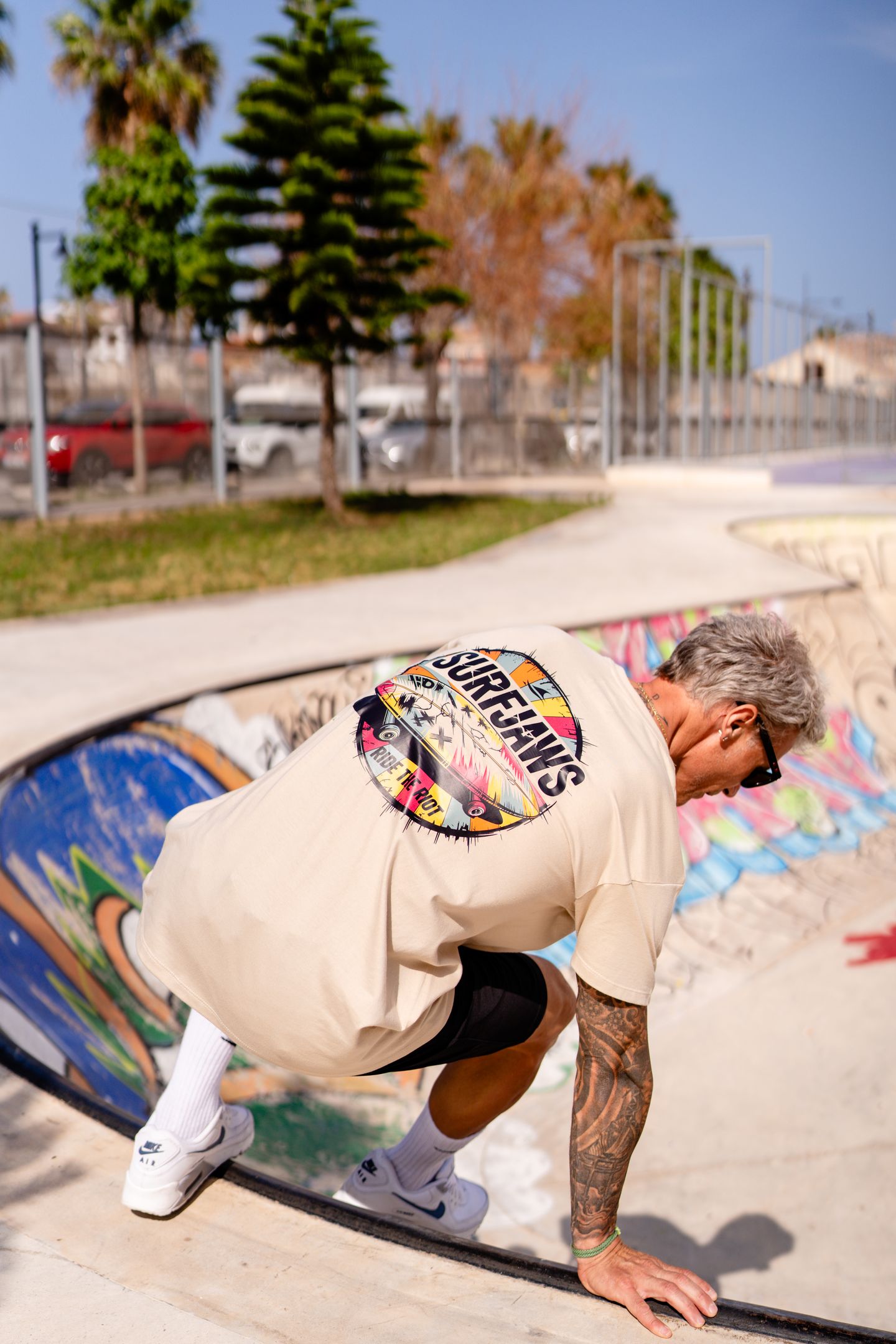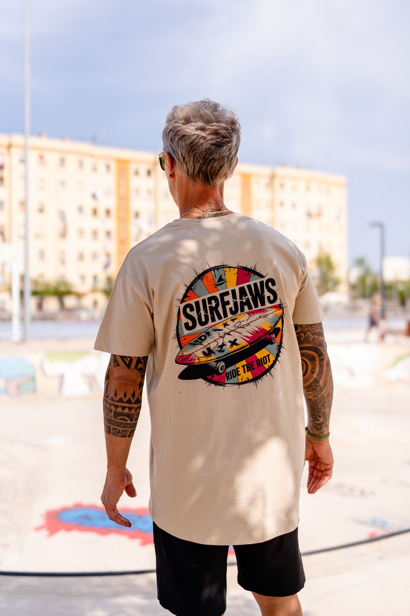 Hay dos tipos de caos: el que se grita y el que se vive. Esta camiseta es para los segundos. "Ride the Riot" es nuestra filosofía: deslízate sobre ese caos, ya sea en una ola o sobre el hormigón de la ciudad. El color arena de la camiseta es el lienzo perfecto para un diseño que sangra calle, con la tabla como arma y la actitud como escudo.