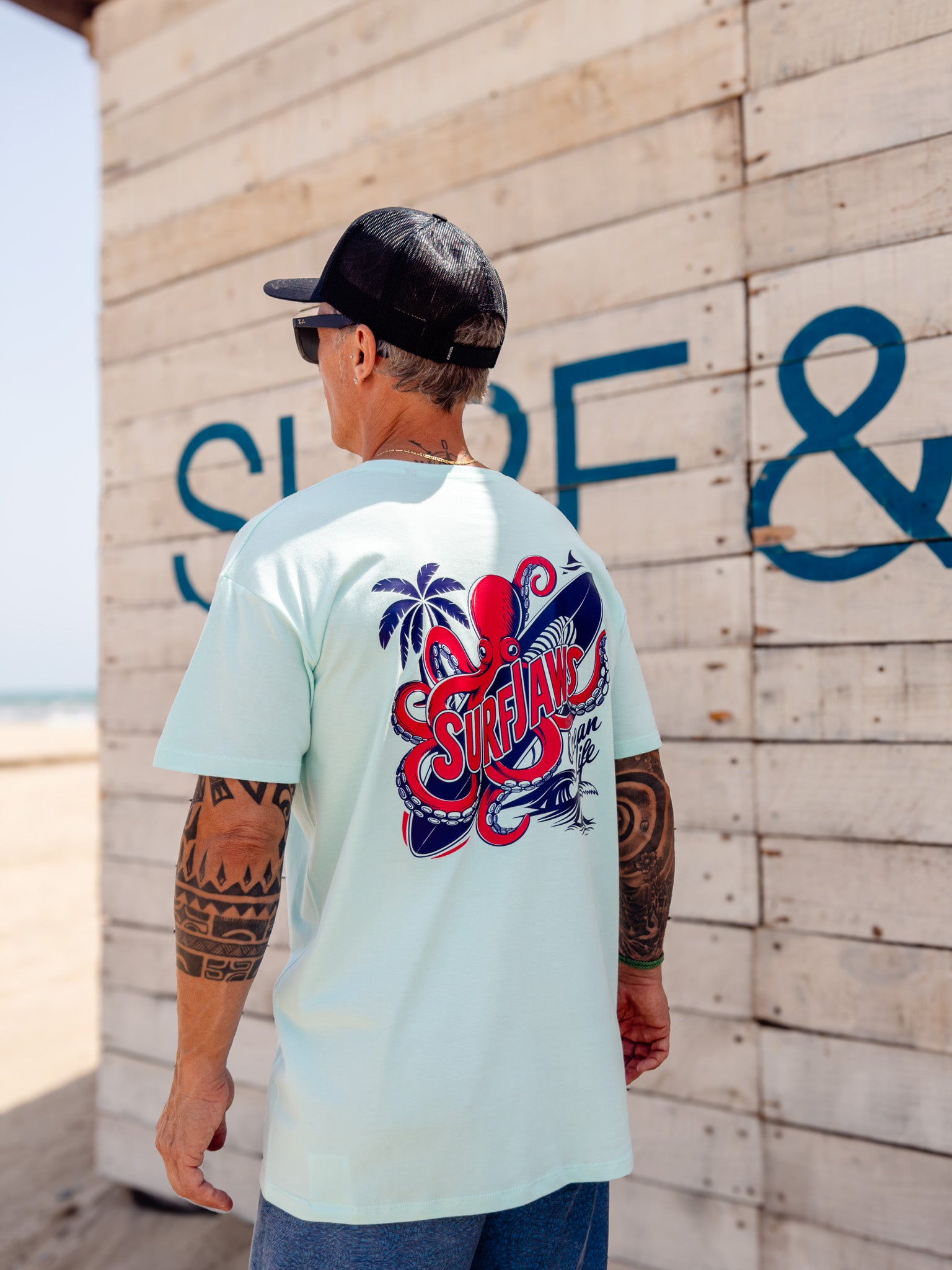 El océano es nuestro hogar y sus criaturas, nuestros hermanos. Esta camiseta es un tributo a la vida marina en su forma más salvaje y poderosa. El pulpo no ataca la tabla, la reclama como parte de su mundo. Es una pieza para los que sienten la llamada de las profundidades, los que entienden que el surf es más que un deporte, es un pacto con la naturaleza.